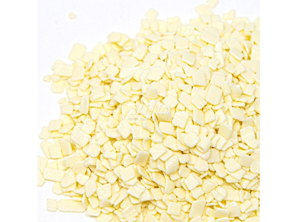 Bílá poleva v šupinkách je univerzální cukrářská dekorace s jemnou strukturou a přirozeně smetanovým tónem. Skvěle vynikne na tmavých čokoládových polevách, barevných dortech i moderních dezertech.