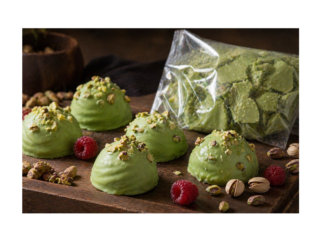 Výborně drží také další dekorace, například cukrové zdobení, perličky, oříšky nebo posypy. Hodí se na moderní pistáciové dezerty, slavnostní dorty, minidezerty, donuts i vánoční cukroví.