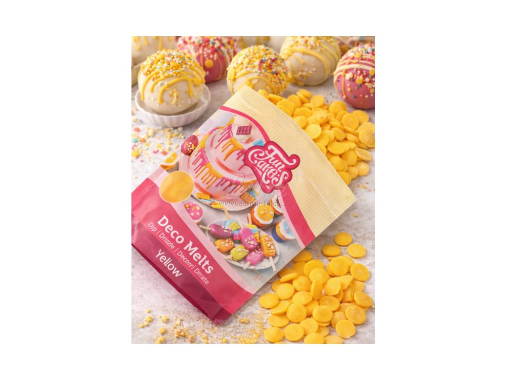 Deco Melts od FunCakes jsou oblíbené cukrářské polevy, které nevyžadují temperování. Po rozpuštění vytvoří lesklý, hladký a rovnoměrný povrch. Díky syté žluté barvě jsou perfektní pro jarní, velikonoční a dětské dezerty, ale i moderní drip dorty.