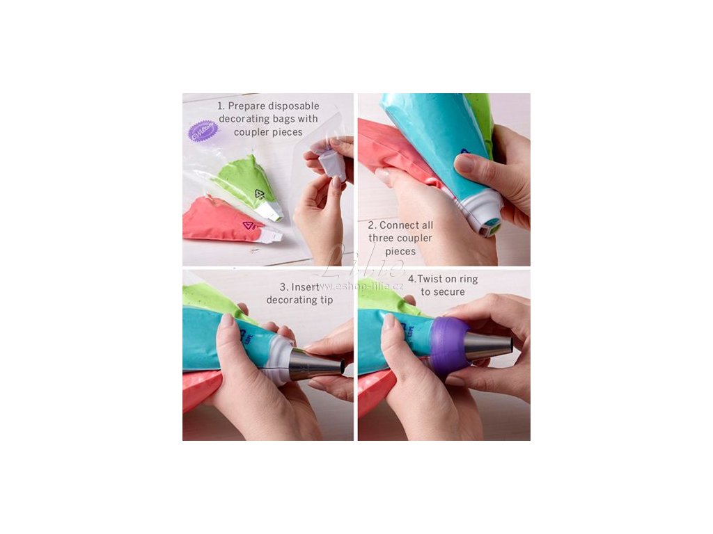 Wilton (prodávají se samostatně) Obsah: 2 cukrářské špičky (1M + 1A), 6 jednorázových zdobicích sáčků (40 cm) a spojku
