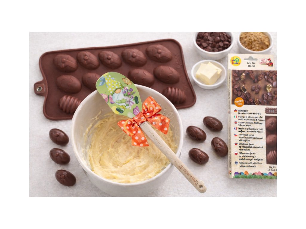 Malá silikonová stěrka na těsto s velikonočním motivem skřítka je ideální cukrářská pomůcka pro míchání krémů, těst, polev i čokolády a hodí se do každé domácí i profesionální kuchyně.