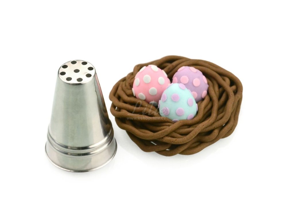 Profesionální cukrářská špička Spaghetti z nerezové oceli je ideální zdobicí tryska na krém, máslový krém, šlehačku i ganache pro tvorbu efektu trávy, vlasů a jemných nudliček na dortech a cupcakes.