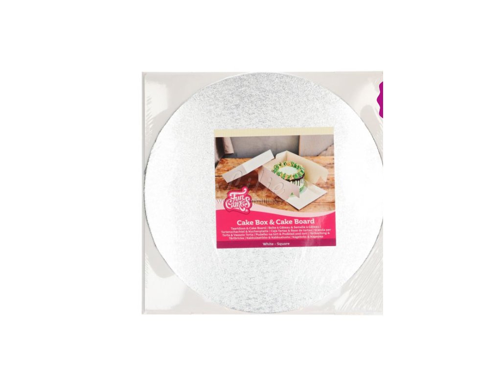 Pevná bílá krabice na dort s kulatou podložkou 3 mm. Ideální pro bezpečný přenos a elegantní prezentaci dortů.