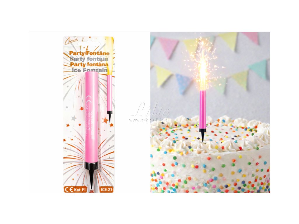 Růžová ledová fontána ICE-22 je ideální dekorací na narozeninové dorty, dětské oslavy a slavnostní příležitosti s výrazným vizuálním efektem.