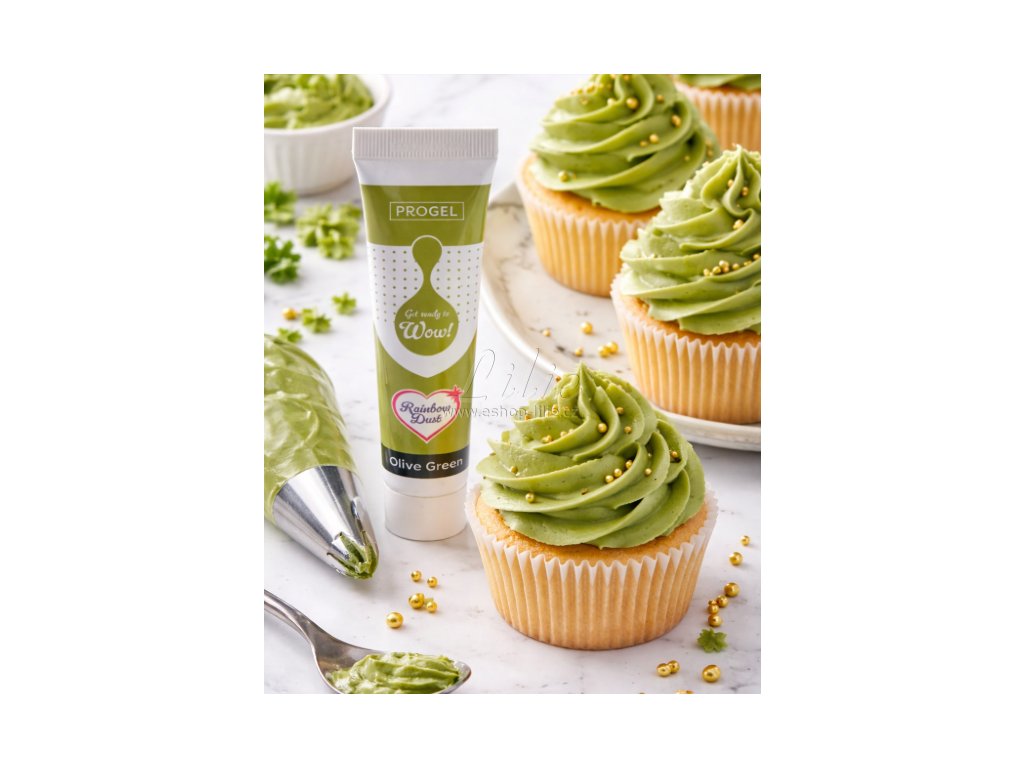 Gelová potravinářská barva ProGel Olive Green je ideální volbou pro moderní dorty, přírodní dekorace a precizní cukrářskou práci.
