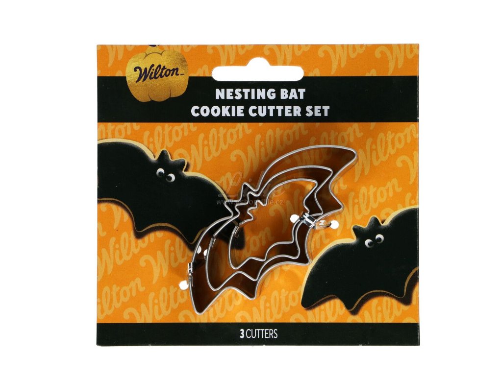 Wilton Nesting Cookie Cutter Bat Set/3 obsahuje 3 nerezová vykrajovátka ve tvaru netopýra o velikostech 4 cm, 6 cm a 8 cm.
