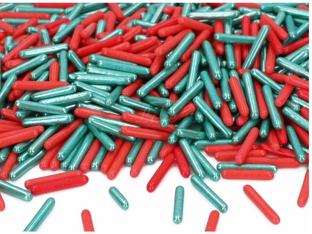 Sprinkle Decoration Sugar Rods Jingle Rods jsou stylové cukrové tyčinky v sytě červené a metalicky zelené barvě. Každá tyčinka má jemné jádro připomínající špagetku a délku přibližně 15–18 mm, díky čemuž působí elegantně a zároveň hravě.