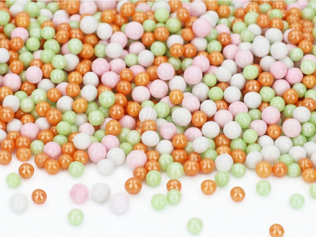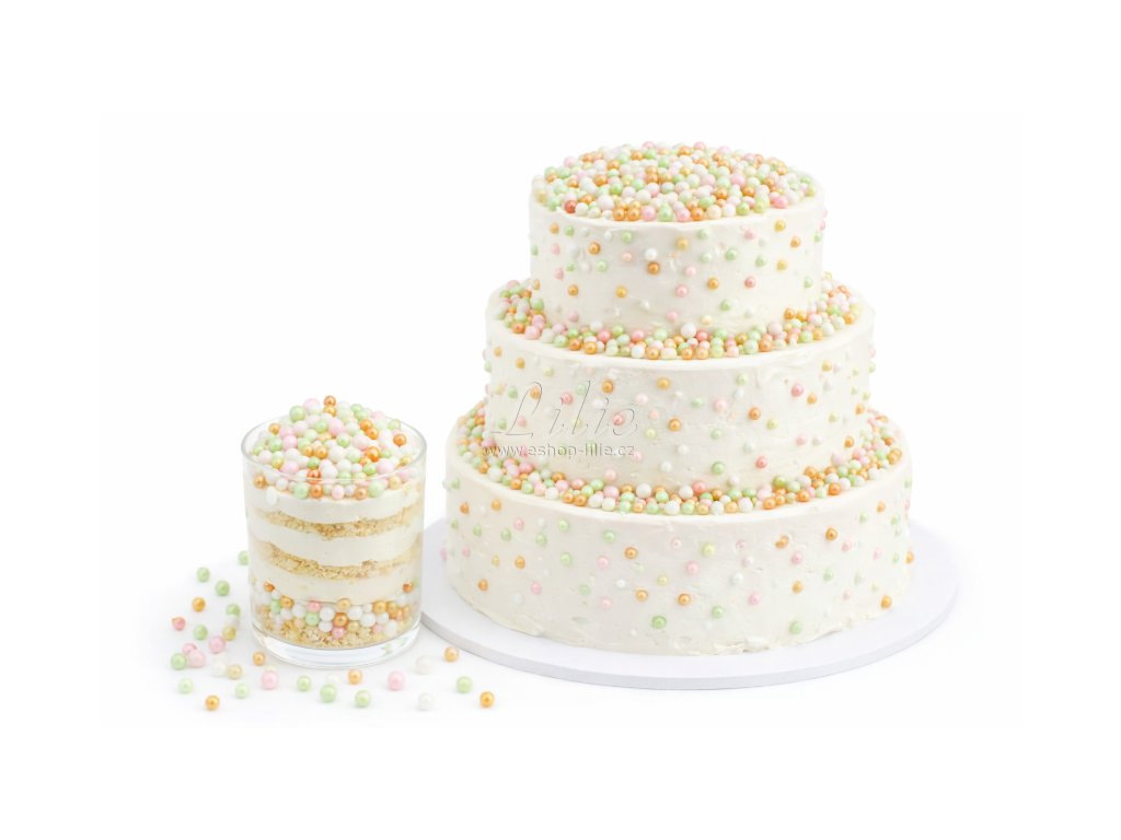 Jedlé měkké cukrové perličky s jemným cukrovým obalem jsou perfektní volbou pro moderní a elegantní zdobení. Díky měkčí konzistenci se pohodlně konzumují a jsou vhodné i na dezerty, kde se počítá s každým soustem. Barevná kombinace bílé, růžové, jablečně zelené a zlaté se skvěle hodí na svatební dorty, jarní a velikonoční dezerty, narozeninové dorty i sladké stoly.