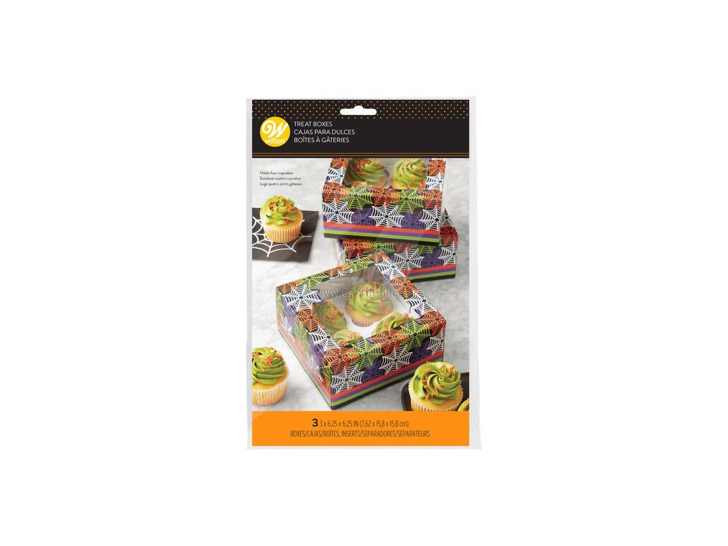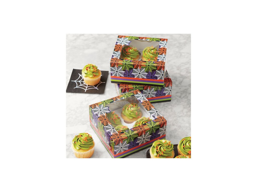 Stylová papírová krabička Wilton s motivem pavučin je ideálním řešením pro balení a přenášení cupcakes. Uvnitř je praktický papírový rozdělovač na 4 muffiny, který zajistí, že se při převozu nepoškodí. Krabici ale můžete využít i na jiné dobroty – sušenky, cukroví nebo pralinky. Krabička je dodávána složená, stačí ji jednoduše rozložit a naplnit. Díky průhlednému plastovému okénku bude váš výtvor krásně vidět i bez otevírání víka.