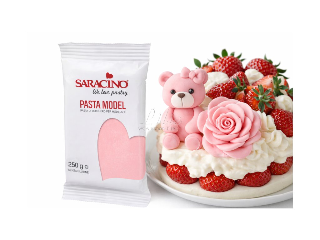 Růžová modelovací hmota Saracino je profesionální cukrářská hmota vhodná na modelování figurek, květin a detailních dekorací na dorty.