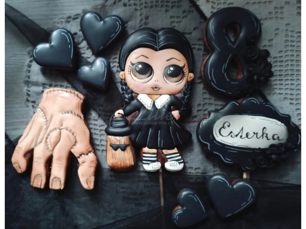 Ideální na Halloween, tematické oslavy Wednesday Addams, seriálové párty, dětské narozeniny nebo jako originální motiv na cukroví a sušenky.