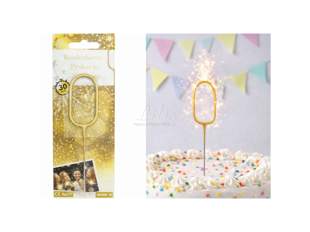 Prskavka číslo 0 na dort je ideální narozeninová dekorace s efektem zlatých jisker, vhodná pro oslavy, výročí i slavnostní focení dezertů.