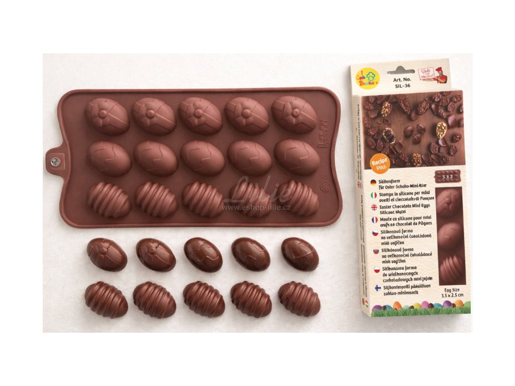 Tato silikonová forma na mini velikonoční vajíčka umožňuje snadnou a precizní výrobu malých čokoládových vajíček, která se skvěle hodí do velikonočních balíčků, jako dekorace dezertů nebo drobný jedlý dárek. Díky kvalitnímu pružnému silikonu se čokoláda nepřichytává a jednotlivé tvary lze vyklopit bez lámání hran i jemných detailů.