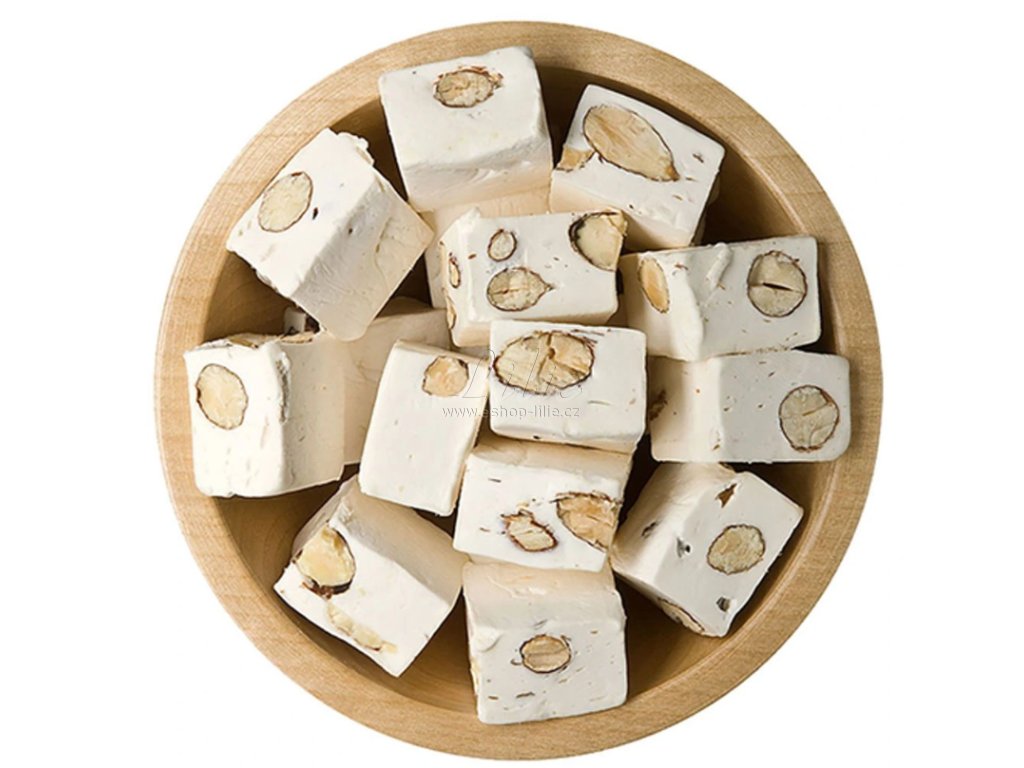 Tyto sněhobílé kostičky z mandlového nugátu potěší milovníky poctivých sladkostí. Nugát s mandlemi se vyrábí ručně z cukru, glukózového sirupu, mandlí a jemného mléka. Jednotlivé vrstvy se roztírají a nechávají zatuhnout, dokud nevznikne obrovský plát, který se následně rozkrájí na malé, neodolatelně měkké kvádříky.