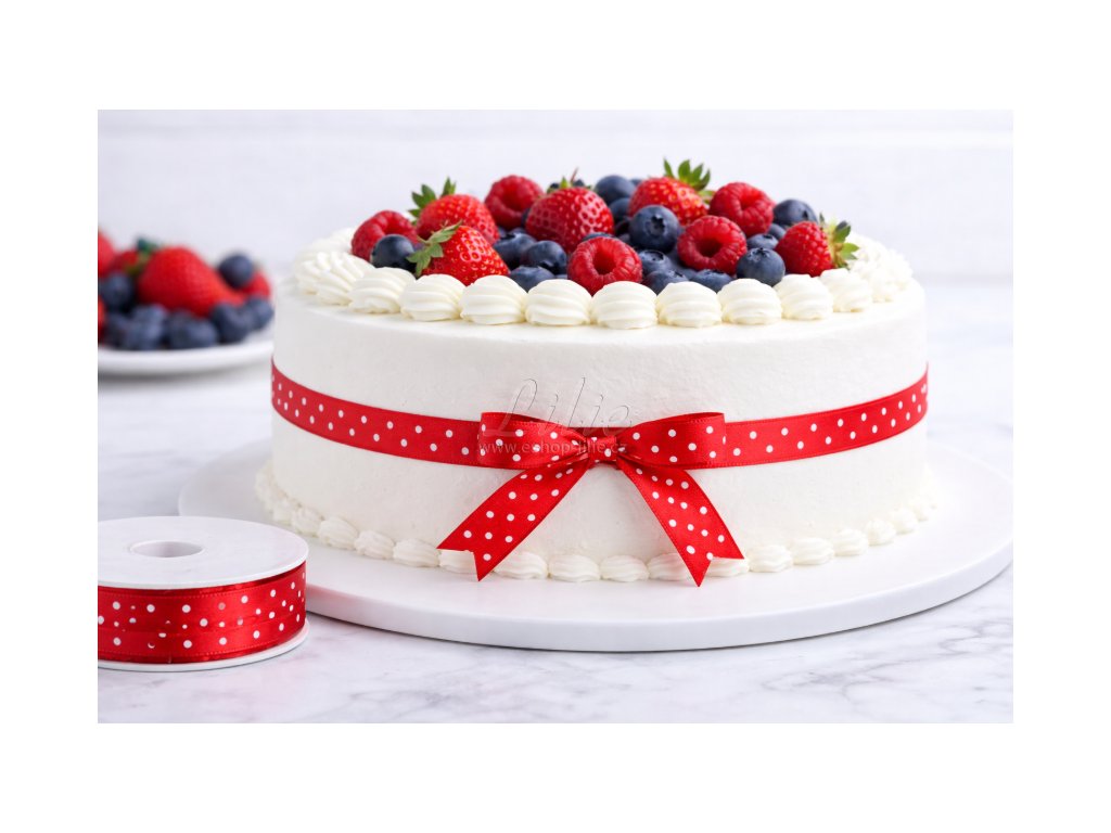 Červená stuha s bílým puntíkem je dekorativní polyesterová stuha vhodná kolem dortů, na cukrářské krabice a slavnostní výzdobu.