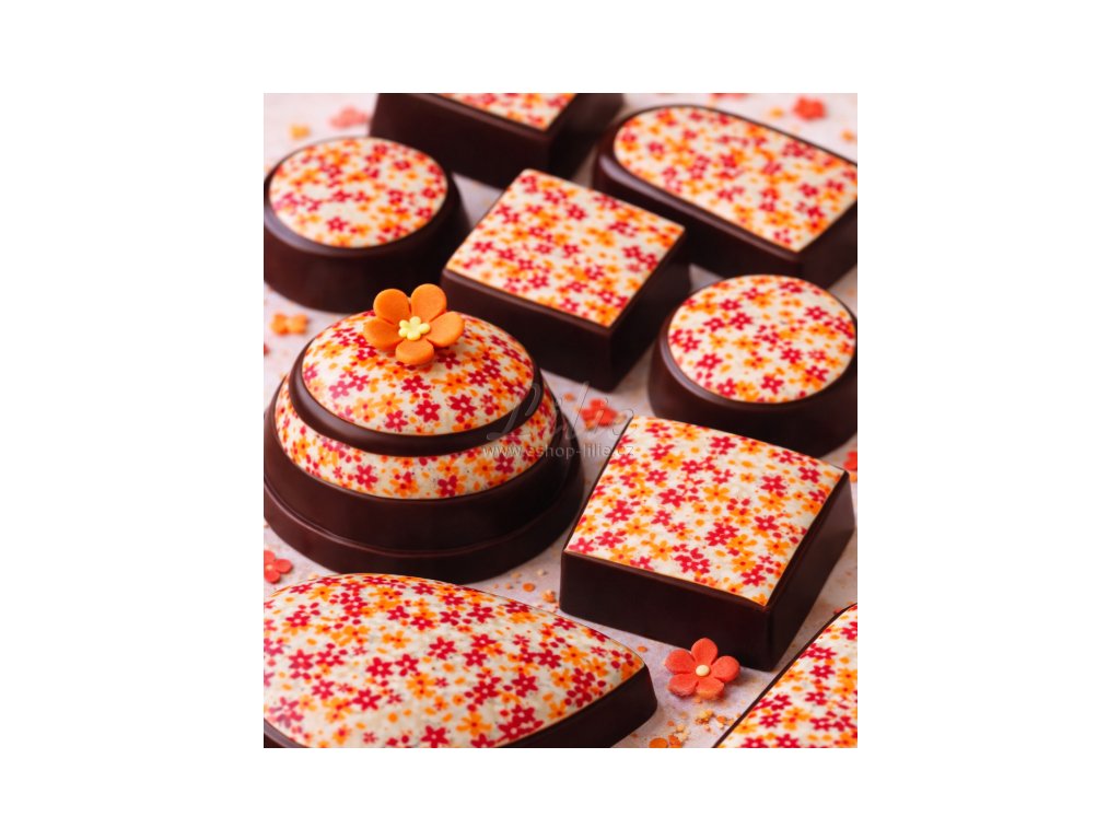 Použití: folii na čokotransfer rozstříhejte obyčejnými nůžkami na potřebnou velikost a tvar. Jelikož je vzor na fólii jen v tenké vrstvě, jde bez problémů stříhat jako papír. Čokoládu rozpusťte buď v mikrovlnné troubě (nastavte ji na mírnější výkon a v průběhu rozpouštění čokoládu několikrát zamíchejte, aby se vám nespálila) nebo nad vodní párou. Rozpuštěnou čokoládu nechte za častého míchání metličkou nebo spirálou vychladnout, až bude jen mírně teplá, nebo spíše vlažná (ale stále tekutá!) a naneseme ji na folii v požadované vrstvě - při teplotě +4 až +8°C dochází do 20 minut ke ztuhnutí čokolády a při sloupnutí fólie zůstává na povrchu čokolády vybraný dekor. Folie je z kokosového tuku, proto dbejte na co minimální kontakt s prsty při manipulaci. Nespěchejte na tuhnutí čokolády - sundáte-li fólii příliš brzy, vzor se vám rozmaže.
